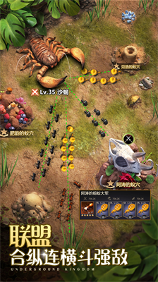 2、动态成长机制:通过资源转化强化蚁群属性,提升工蚁运输效率与兵蚁作战能力