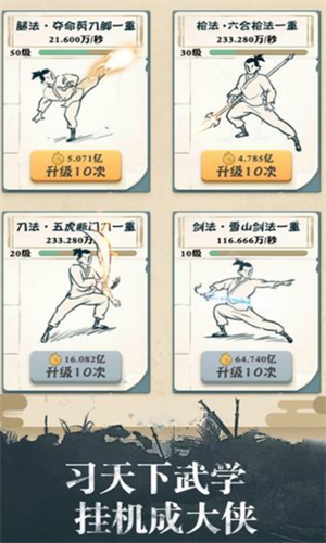 每位侠客自带基础绝技,通过提升角色品阶可逐步解锁三种进阶招式。角色成长体系分为初窥门径、略有小成、融会贯通、登峰造极四个阶段,伴随品阶提升将激活特殊战斗特效。