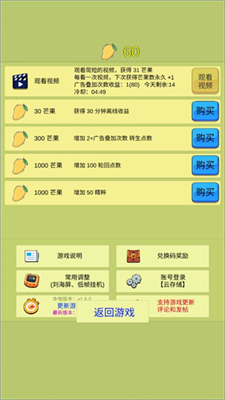 PS:游戏为免费版本,不看广告就可以获得芒果,使用后越用越多。
