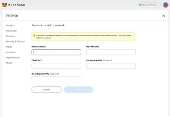 3、系统将自动开启新配置面板,用户需准确填写网络参数信息。此阶段需特别注意各项技术参数的准确性,包括网络名称、链ID、符号单位等核心数据。