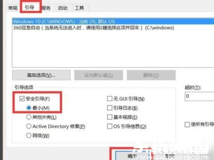 第二步:在系统配置界面顶部导航栏选择引导标签页,勾选安全引导与最小两个复选框。完成设置后点击确定并重启设备,系统将自动进入安全模式。