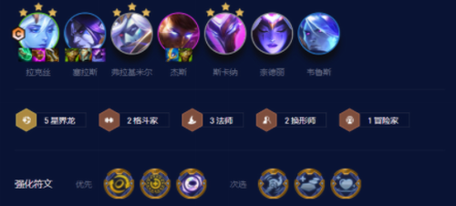 主力配置:拉克丝(主C)、塞拉斯(主坦)、弗拉基米尔、杰斯、斯卡纳、奈德丽、韦鲁斯。七人口成型阵容包含5星界龙/3法师/2格斗家羁绊,后期可根据战况升级为法师索尔体系。
