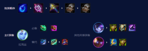 拉克丝必备朔极之矛保证技能循环,输出装备建议两套方案:①珠光护手+无尽之刃实现暴击爆发 ②灭世者之帽+巨人杀手应对前排阵容。主坦塞拉斯优先装备传送门吸收伤害,次选石像鬼板甲与巨龙之爪组成双抗体系。杰斯携带大天使之杖叠加法强,剩余装备可选择泰坦的坚决等半肉装。