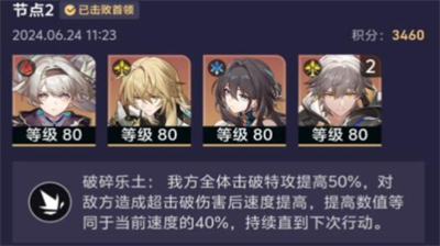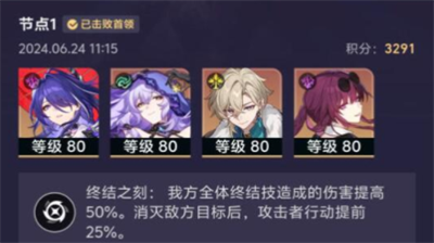 针对下半场特殊机制,超击破体系展现极强适应性。流萤与同谐主的战技配合罗刹(或未出场但理论更优的加拉赫)的终结技,可快速达成韧性击破。破防状态下,流萤两次完整终结技即可完成对银枝的斩杀。该阵容虽需绑定阮·梅与同谐主,但其培养成本与实战收益比在平民阵容中极具优势,建议资源有限的玩家优先投入培养。