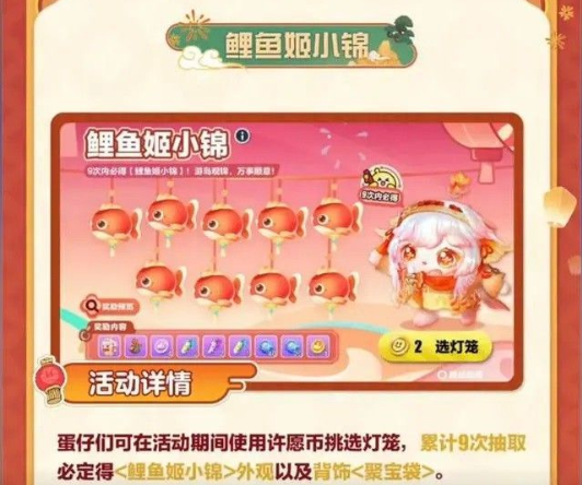 本次限定活动采用创新性灯笼许愿玩法,玩家在3月1日开启的活动周期内,通过消耗许愿币参与灯笼挑选即可累积幸运值。当抽取次数达到九次时,系统将自动发放包含鲤鱼姬小锦外观及专属背饰聚宝袋的完整礼包。该机制既保障了玩家的基础获取权益,又保留了趣味性互动体验。