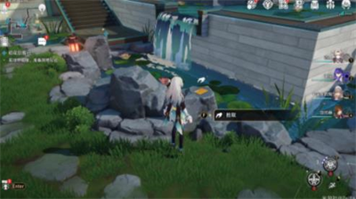 2、完成空间折跃后,玩家需以传送锚点为圆心展开环形搜索。重点观察水景园林布局,在东南侧人造景观区可见错落堆叠的太湖石组。此处造景采用璃月传统叠石技法,假山缝隙间若隐若现的典籍微光即为目标物。
