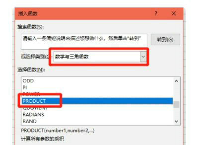2、定位运算函数:在函数分类列表中选择数学与三角函数类别,从函数库中找到PRODUCT函数。该函数支持同时计算多个数值的乘积,当需要连续相乘超过两个单元格时尤为实用。选中目标函数后点击确定按钮进入参数设置界面。